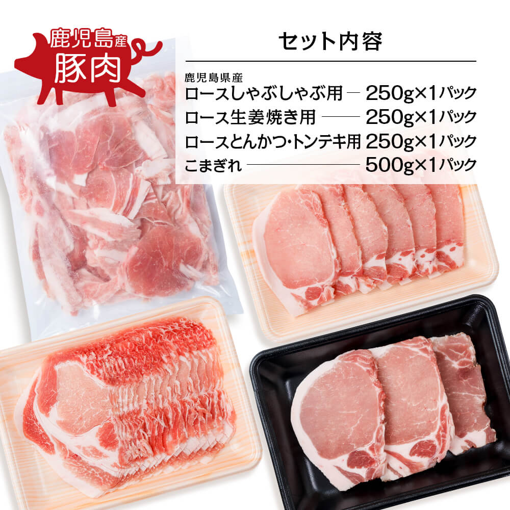 ・鹿児島県産 豚ロースしゃぶしゃぶ用 250g×1パック ・鹿児島県産 豚ロース生姜焼き用 250g×1パック ・鹿児島県産 豚ロースとんかつ・トンテキ用 250g×1パック ・鹿児島県産 豚こまぎれ 500g×1パック |