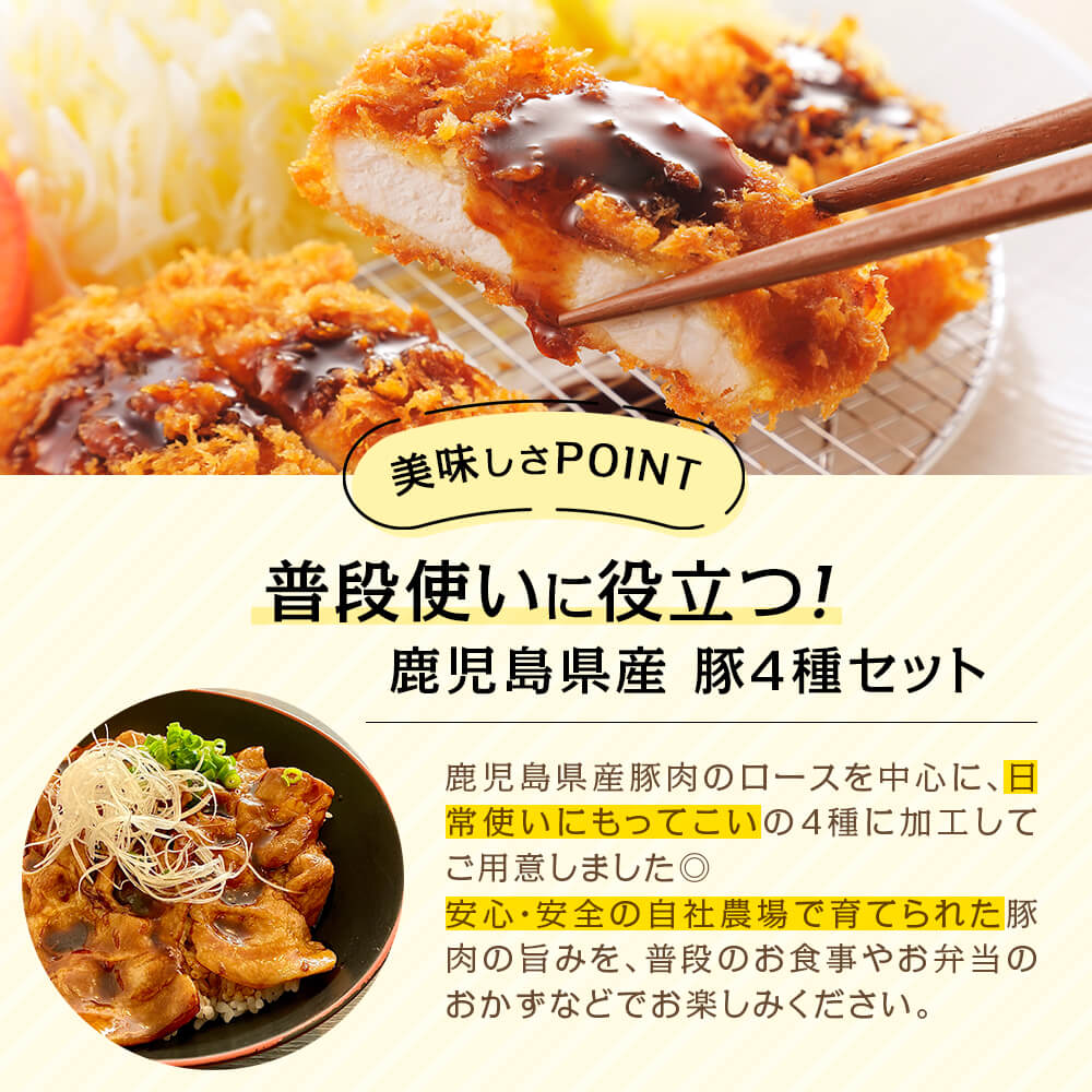 普段使いに役立つ鹿児島県産の豚4種セット! 安心・安全の自社農場で育てられた豚肉の旨味を、普段のお食事やお弁当のおかずなどでお楽しみください。