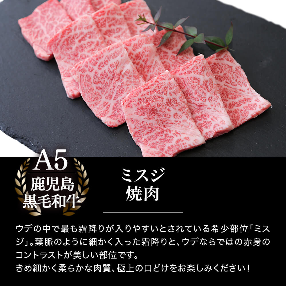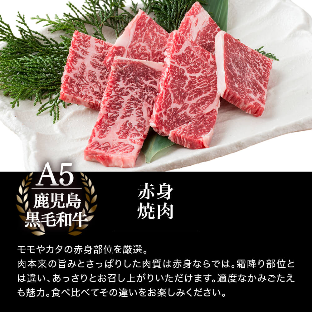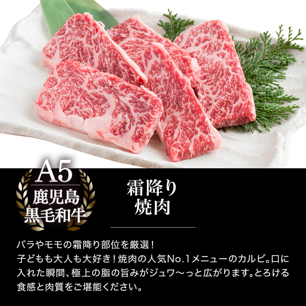 ・A5等級 鹿児島県産黒毛和牛 霜降り焼肉:バラまたはモモ ・A5等級 鹿児島県産黒毛和牛 赤身焼肉:モモまたはカタ ・A5等級 鹿児島県産黒毛和牛 ミスジ焼肉:カタ |
