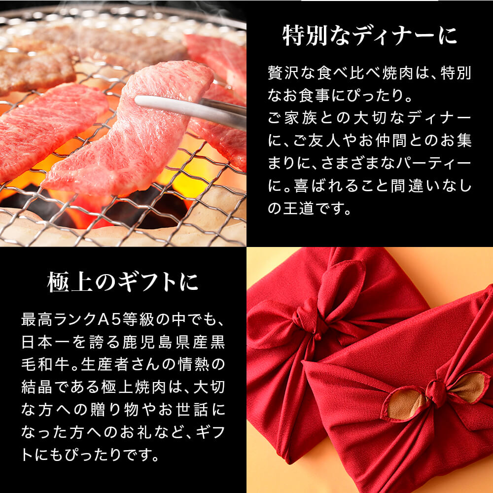 【送料無料】 和牛オリンピック日本一に輝いた畜産大国鹿児島産のA5等級 黒毛和牛。 厳選した霜降り・赤身・希少部位ミスジを贅沢に焼肉で食べ比べ! 脂の旨みや赤身本来の旨み、くちどけや食感の違いを食べ比べてお楽しみください。 |