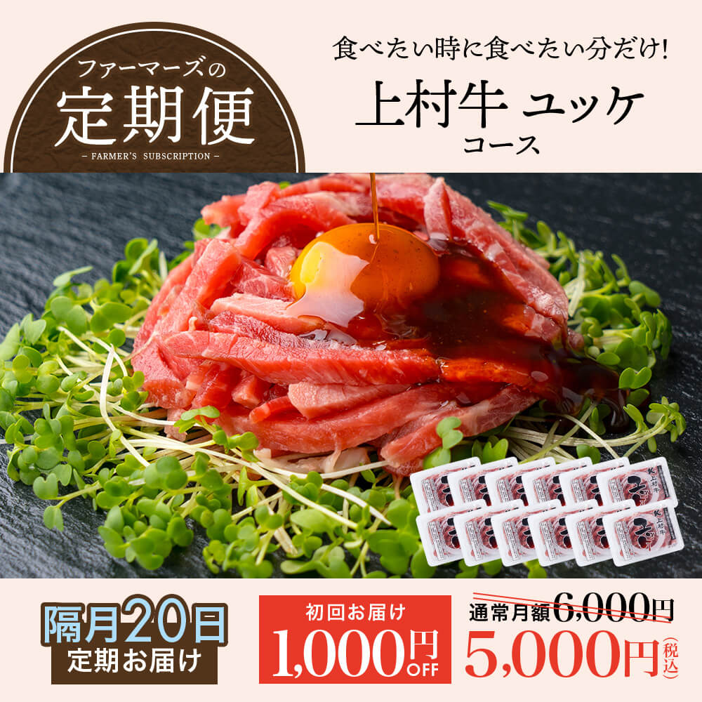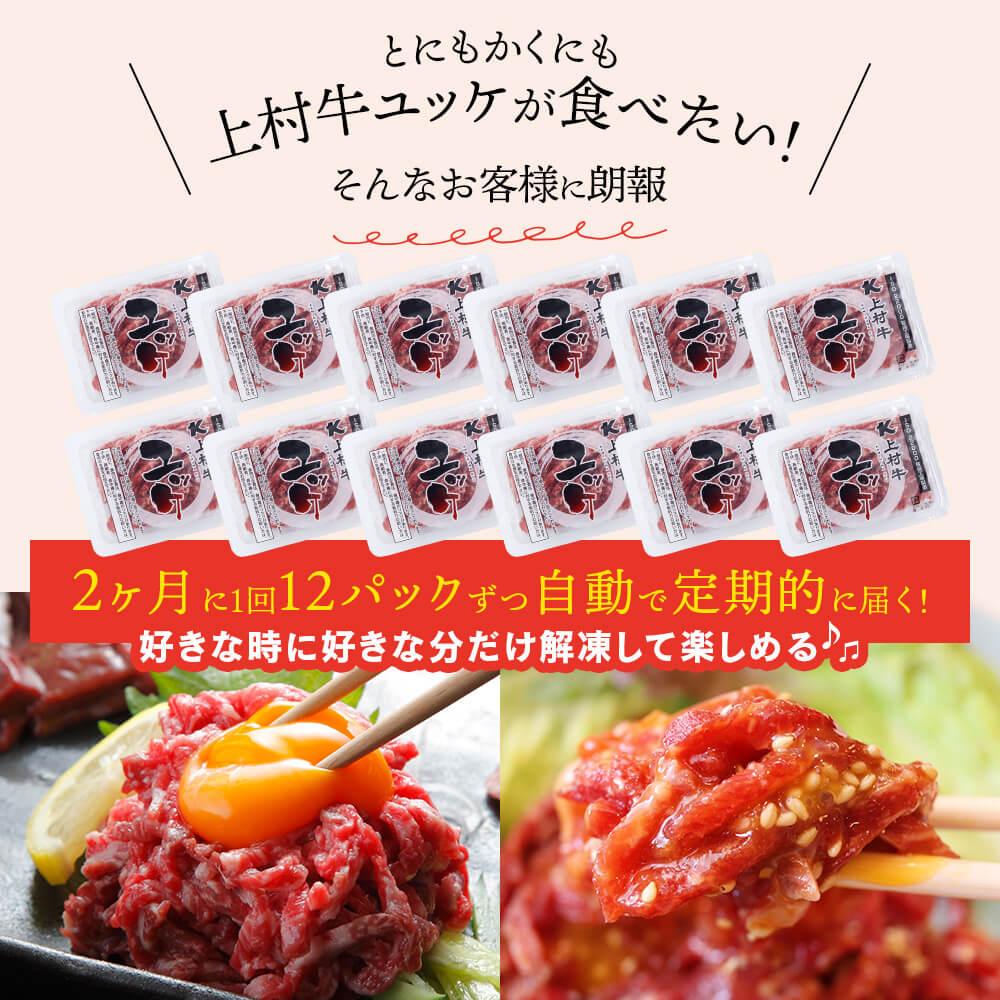 【ファーマーズの定期便|送料無料】上村牛 ユッケコース 12パックが2ヶ月に1回届く!食べたい時に食べたい分だけ【隔月20日お届け】肉のプロ カミチクが自信を持っておすすめする安全・安心で美味しい上村牛 ユッケを定期的にお届け♪|お歳暮・冬の特選ギフト