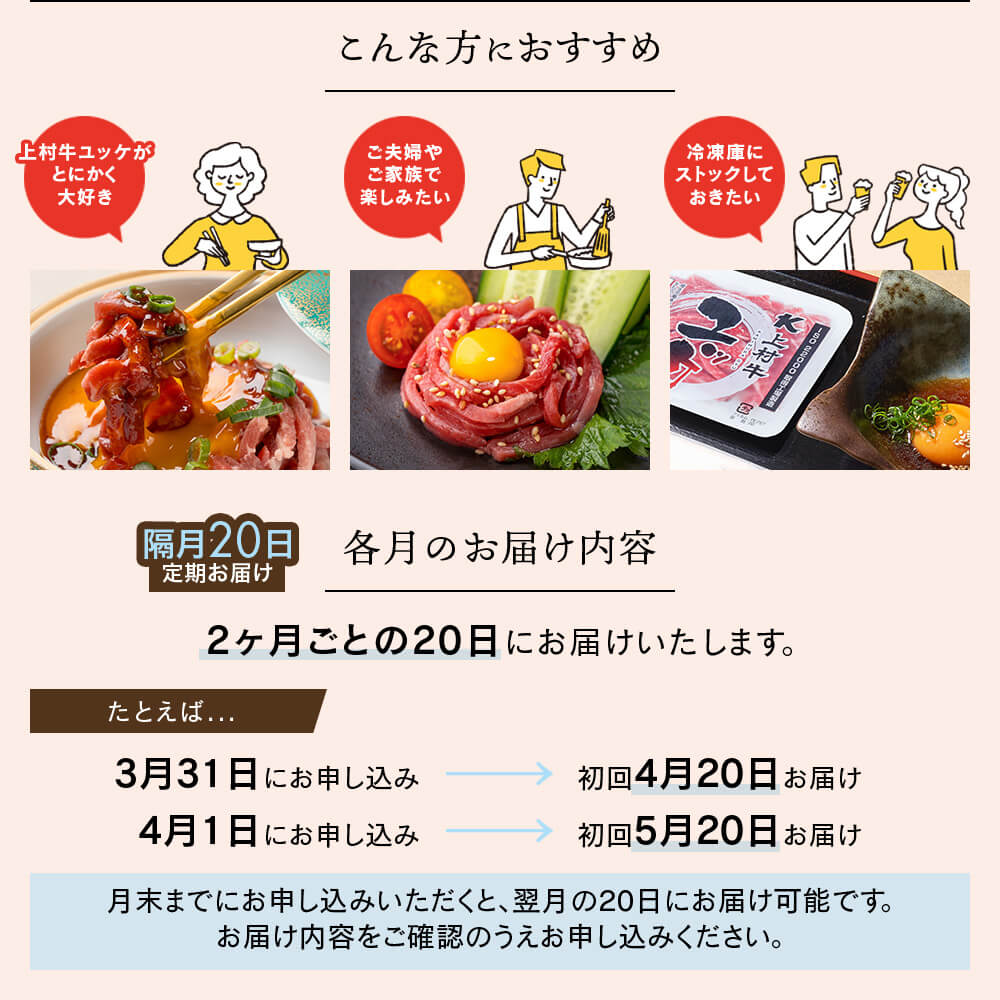| コース名 | 上村牛 ユッケコース|隔月に1回 20日にお届け |