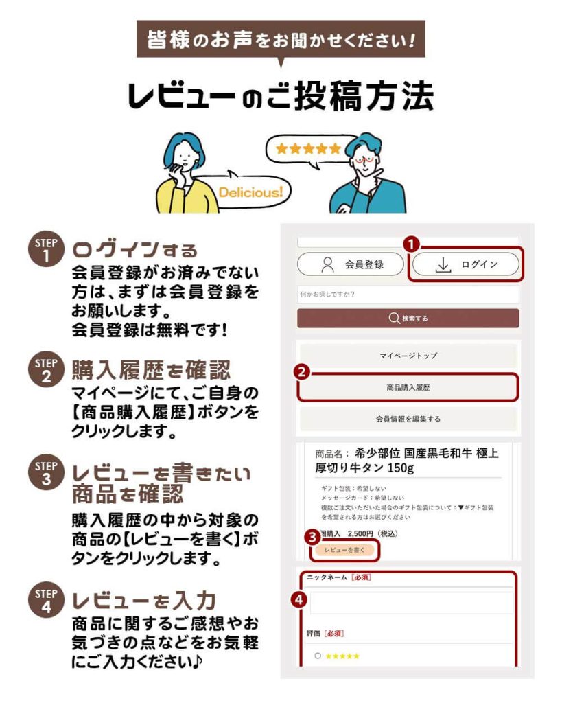 ログイン後、マイページの商品購入履歴からご投稿いただけます。 →商品購入履歴は こちら |