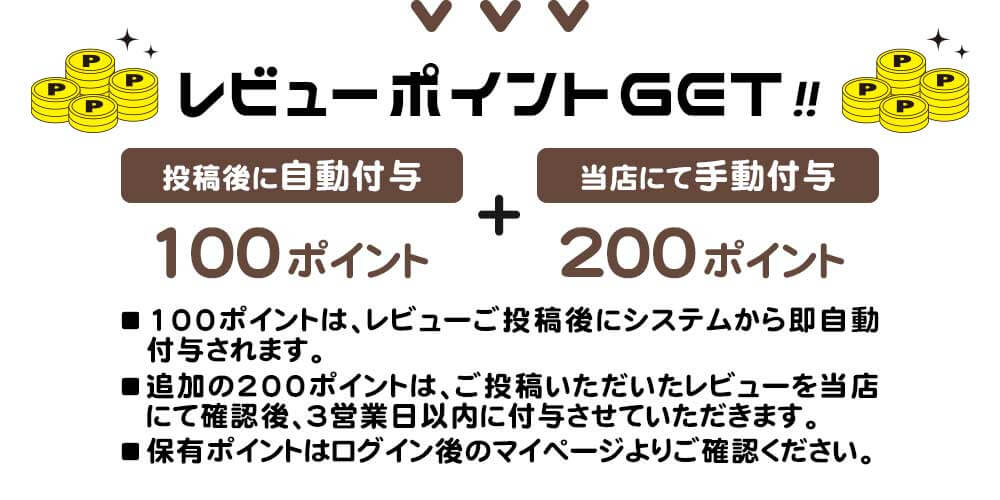 ・100ポイントは、レビューご投稿後にシステムにて即自動付与されます。 ・追加の200ポイントは、ご投稿いただいたレビューを当店にて確認後、3営業日以内に付与させていただきます。付与後、メールにてご連絡させていただきます。 |